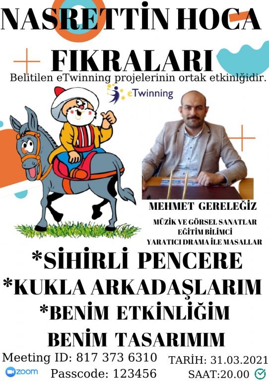 MÜZİK VE GÖRSEL SANATLAR EĞİTİM BİLİMCİSİ MEHMET GERELEĞİZ ÖĞRENCİLERİMİZE ZOOM ÜZERİNDEN SAAT 20.00DA NASRETTİN HOCA FIKRALARIYLA ANLATACAK. TÜM ÖĞRENCİLERİMİZE AÇIK OLAN PROGRAMA KATILIM SAĞLAYABİLİRSİNİZ.